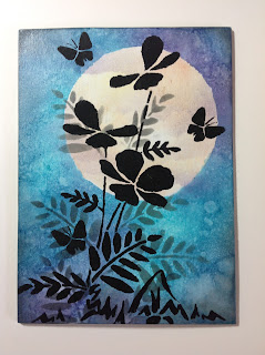 Once the matte medium was dry I painted the flowers using the same mixture of watercolour and matte medium as before . I used the same colours but much stronger than before so that the flowers stood out from the background.